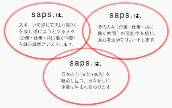 目標達成において、社員はもちろんパートナー企業様の協力も不可欠です。 だからこそ、サップスは三方良しの関係に徹底的にこだわります。 saps の社名の由来は、sports assist possibility support です。 「サップスに依頼すると何とかなる。」という関係企業様のお声を頂いており、 どのような要望に対しても、即お断りする事はなく、 実現できるように働きかけることを意識し、パートナー企業様の発展の為に 誠実に対応しています。 そして、何よりお客様へ価値ある商品(人・モノ・サービス)を提供し続ける体制であり続けるため、常に 新しい情報に目を向け、お客様、社員と情報を共有し時代を先取りした社会貢献を目指しています。