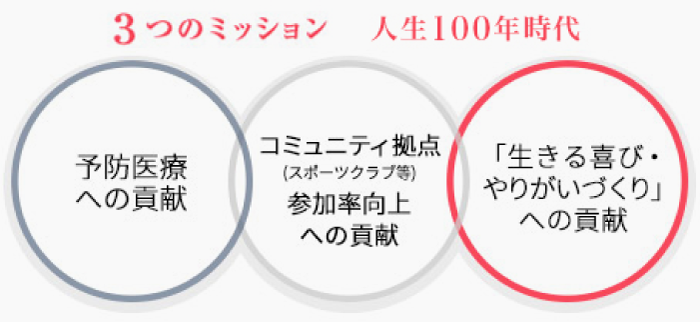 Sapsの3ミッション私たちには夢があります。それは、「スポーツ・健康・美容」をテーマにした、人がふれあい笑顔があふれるウェルネスコミュニティ拠点を創り出すこと。そして、そのウェルネスコミュニティ拠点を全国各地に広げ、人々の笑顔の輪を増やすことです。高齢化が進む社会で大切なのは、人と人とのつながりです。「愉しみと心地よさ、そして生きる喜びをも与える」社会(サービス) の実現を目指します。勇気を無くさず、 信念を持って、情熱を注ぐことを念頭に置き、全社一丸となって、3つのミッションに取り組んでいます。